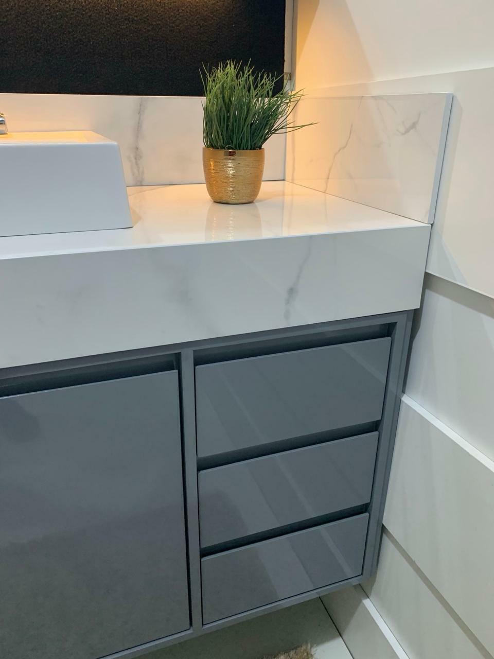 Fabricado em MDF laqueado cinza, acompanha bancada em porcelanato polido carrara, que não mancha nem retém umidade, perfeito para ambientes úmidos.