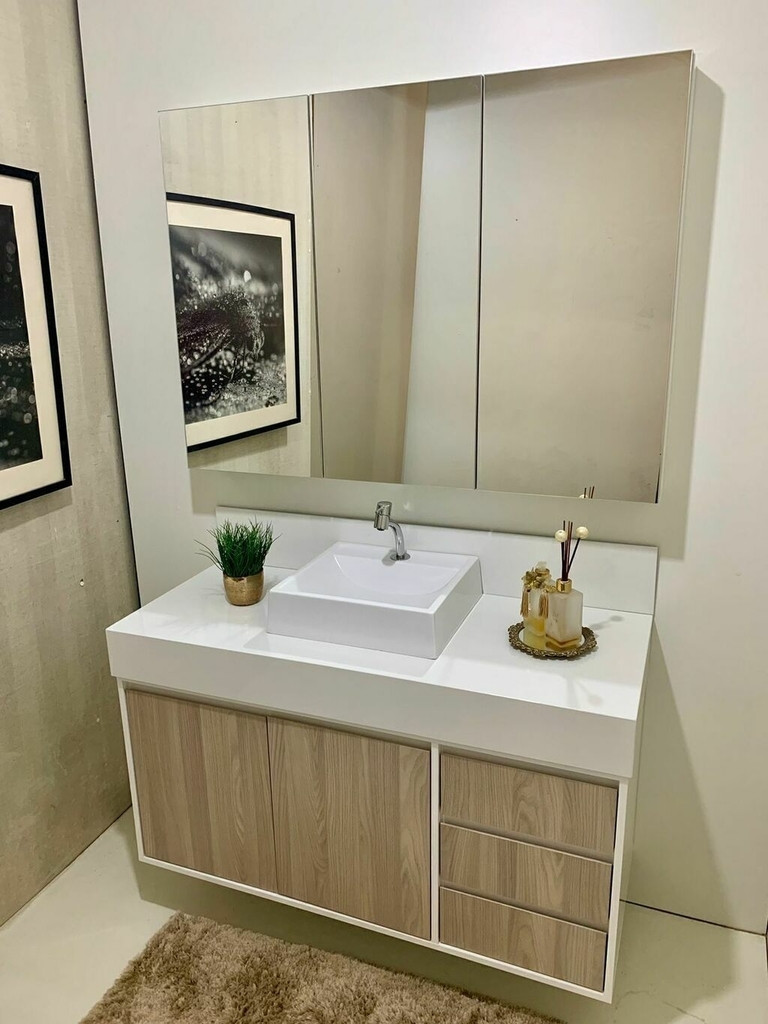 Fabricado em MDF Carvalho / Branco, acompanha bancada em porcelanato polido branco, que não mancha nem retém umidade, perfeito para ambientes úmidos.